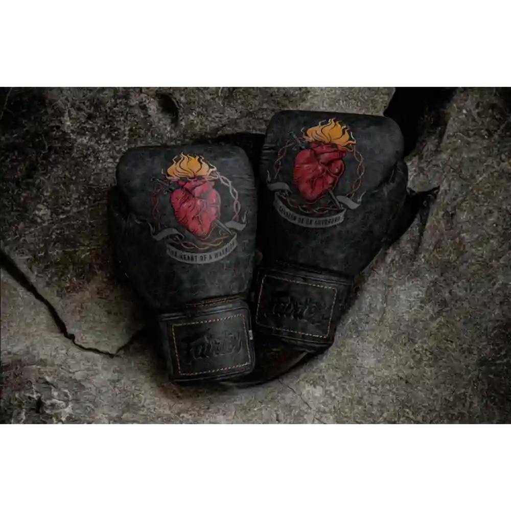 Modellen ”Heart of a Warrior” är resultatet av ett unikt samarbete mellan varumärket Fairtex och Tom Atencio – tidigare vice vd för det legendariska varumärket Affliction. Detta projekt är en unik kombination av två världar: motorcykelkultur och kampsport. Handskarna refererar inte bara till stilen, utan också till andan i båda miljöerna – styrka, passion och mod. Handskarna är tillverkade enligt det karakteristiska Fairtex-snittet, vilket garanterar en perfekt passform och hög prestanda under träning. De använder ett skum i tre lager, vilket garanterar effektiv dämpning och handskydd. Hela handsken är täckt med högkvalitativt svart naturläder i vintagestil och helheten kompletteras med ett tryck med ett heligt hjärtmotiv. Varje par handskar är förpackade i en särskild nylonväska, dekorerad med en flätad läderrem och en dödskalle-detalj – vilket understryker den unika, råa karaktären hos denna modell