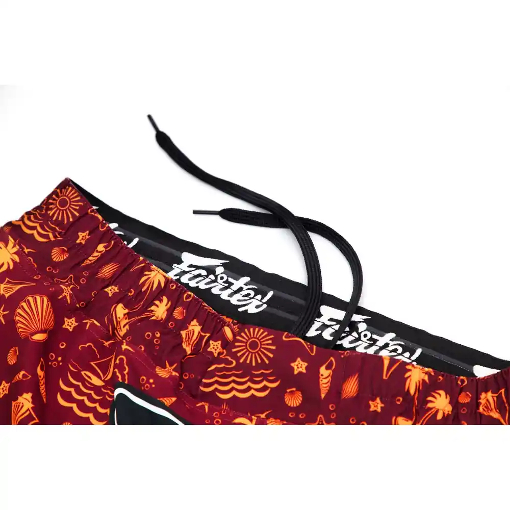 Ta med dig lugnet från havet till din träning med Fairtex ”Breeze” MMA-shorts. Den vinröda modellen är dekorerad med ett subtilt strandinspirerat tryck – du hittar palmer, sjöstjärnor, snäckor, fåglar och båtar i en delikat orange nyans, och det hela kompletteras med en distinkt Fairtex MMA-logotyp i mitten. Shortsen är designade för både högintensiv träning och vardagskomfort, vilket gör dem till ett perfekt val för fighters som uppskattar snygg men dämpad design. Med en skräddarsydd atletisk skärning och en elastisk panel i grenen av spandexmaterial ger shortsen full rörelsefrihet – från höga sparkar till markkamp. En 10 cm lång sidoslits ökar rörligheten, medan ett elastiskt midjeband med invändig dragsko ger en stabil och bekväm passform under intensivt träningspass