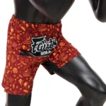Ta med dig lugnet från havet till din träning med Fairtex ”Breeze” MMA-shorts. Den vinröda modellen är dekorerad med ett subtilt strandinspirerat tryck – du hittar palmer, sjöstjärnor, snäckor, fåglar och båtar i en delikat orange nyans, och det hela kompletteras med en distinkt Fairtex MMA-logotyp i mitten. Shortsen är designade för både högintensiv träning och vardagskomfort, vilket gör dem till ett perfekt val för fighters som uppskattar snygg men dämpad design. Med en skräddarsydd atletisk skärning och en elastisk panel i grenen av spandexmaterial ger shortsen full rörelsefrihet – från höga sparkar till markkamp. En 10 cm lång sidoslits ökar rörligheten, medan ett elastiskt midjeband med invändig dragsko ger en stabil och bekväm passform under intensivt träningspass